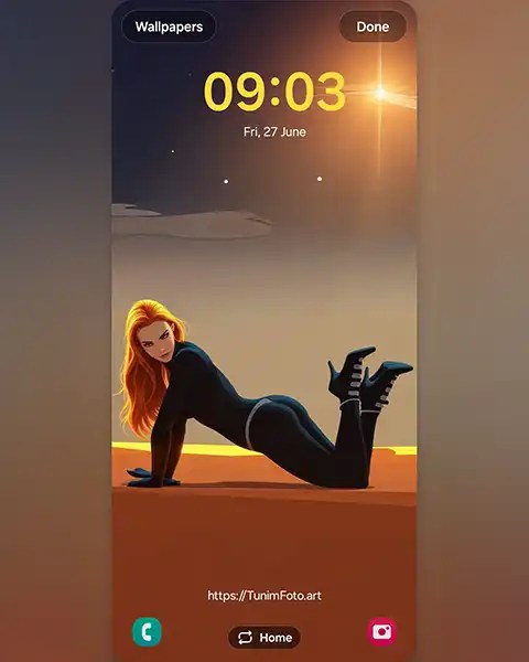 MAE as Stylized illustration of a woman adjusting her dress, showcasing elegance and grace; Download free phone wallpaper 9:21